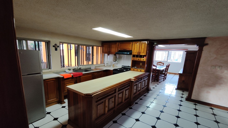 Cocina moderna y bien iluminada con isla central, estufa, refrigerador y amplias ventanas. Perfecta para cocinar y convivir.